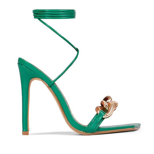 New Arrivals Women Shoes 2020 Ring-Leader Chunky Chain Detail Lace Up Square Toe Heel In Green Faux Leather Women Heeled Sandals