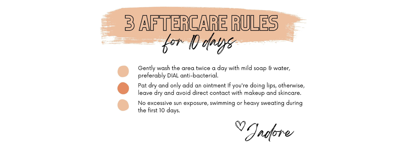 After care is crucial, it is very important to follow these instructions for the full 10 day healing period to ensure proper healing and color retention. Results will vary for all individuals and we can not guarantee your results.